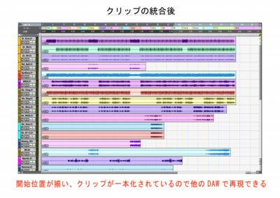 - 統合前は各トラックのクリップがバラバラに存在しているため、このままでは他のDAWに貼り付けるのにすごい手間がかかってしまう。それにファイル数がかさんで収集がつかなくなってしまう。