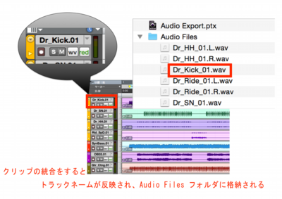例)オリジナルが 24Bit 48KHz WAVのセッションならば、書き出した統合後のファイルも 24Bit 48KHz WAV のファイルになる